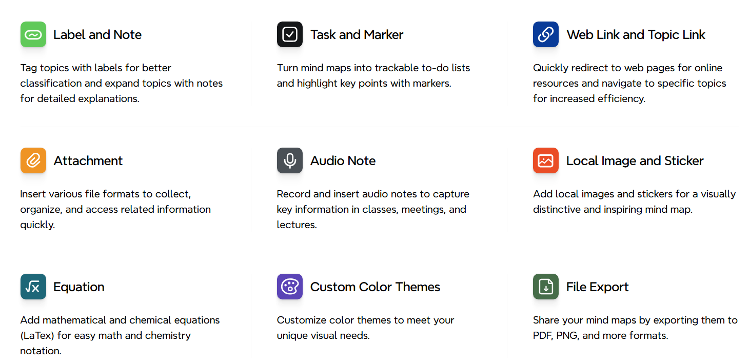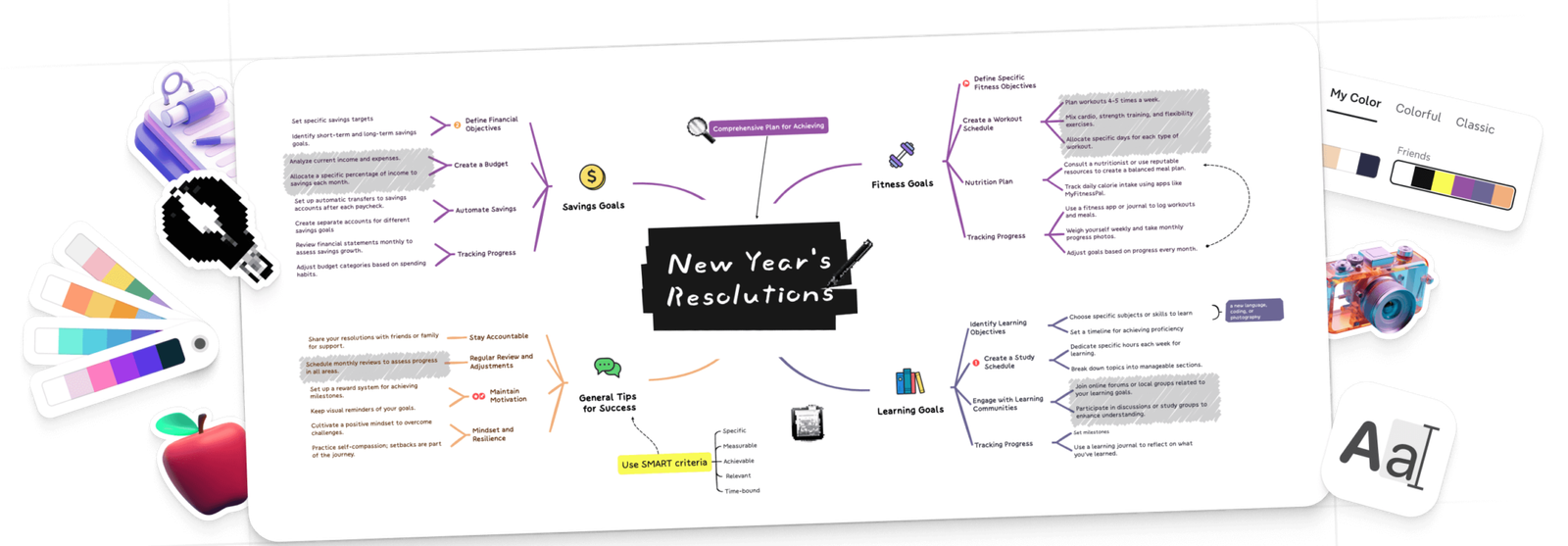 Let your ideas stand out with just a few clicks. Customize text styles, apply colorful themes, and polish your map with artistic illustrations and powerful stickers.